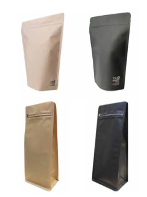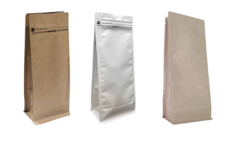 Les sachets à fond plat en Kraft et en finition blanche mate au toucher doux avec barrière sont principalement conçus pour l’industrie des boissons comme le café et le thé.
